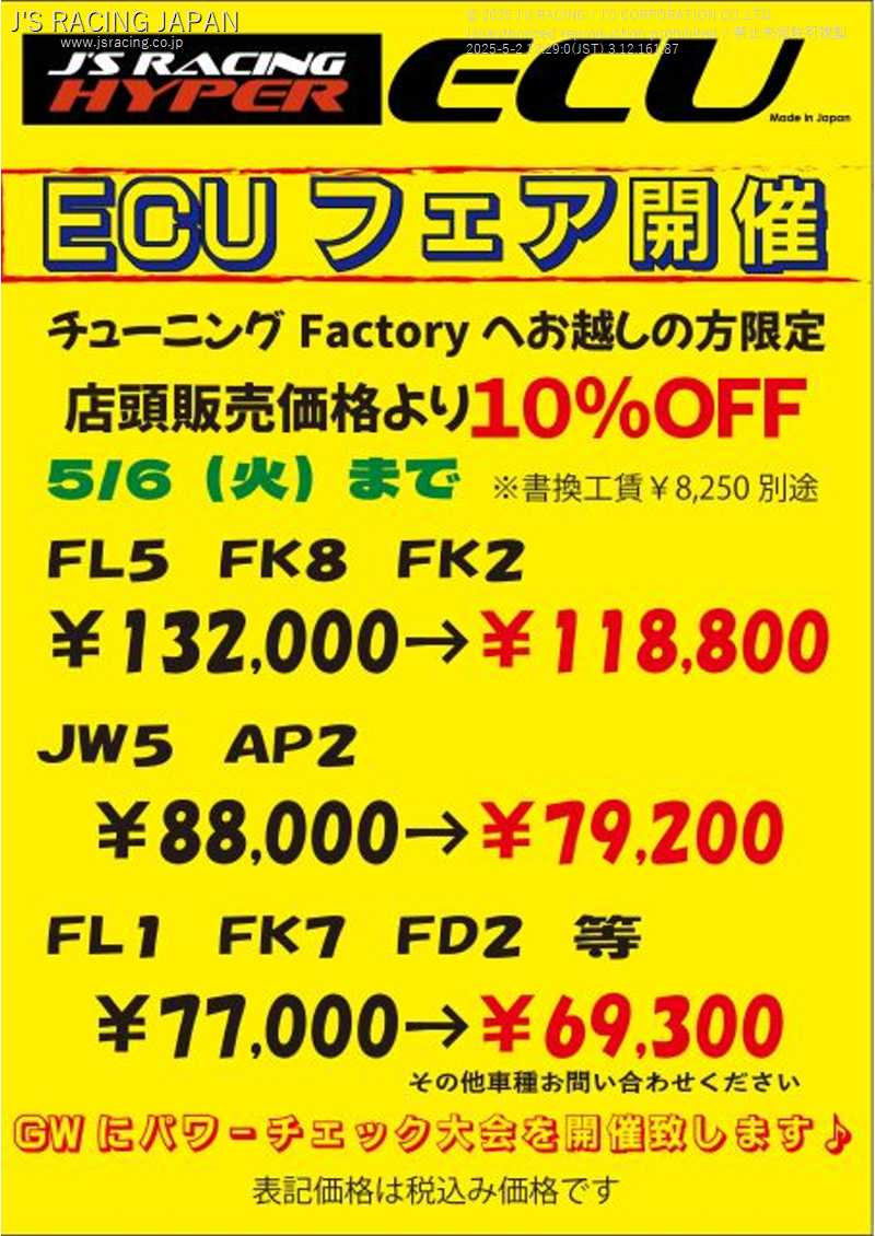 2025年4月1日(火)から2025年5月6日(火)までチューニングファクトリーにてECUフェアを開催致します。期間中はHYPER ECU書換が10%OFFになります!ECUチューニングをご検討いただいてる方はこの機に是非ご来店ください!