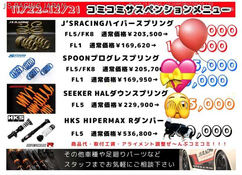 11/22〜12/21の期間限定でサスペンションフェアを開催いたします! 期間中はJ’SRACINGハイパースプリングをはじめ、 ストリートからサーキットまで幅広いユーザーに向けた各種モデルを 特別キャンペーン価格にてご提供いたします。