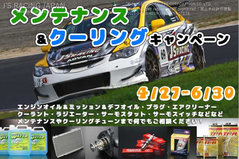 4月27日(土)〜 6月30日(日)までの間、J’S RACINGファクトリーにて「メンテナンス&クーリングキャンペーン」を開催します!!!