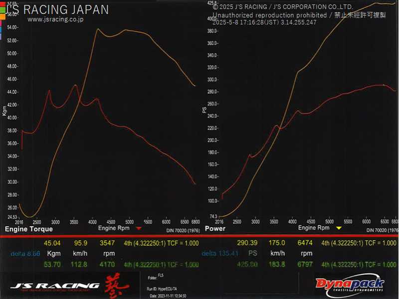 そこでこのチューニングパッケージでは、最大限のコストパフォーマンスを求めインジェクター、高圧フューエルラインの交換に留め極力コストを下げながら、HYPER-ECUにて完全に制御することにより、フルノーマル状態から最大出力において約135PSの上昇(実測値290→425PS)を達成。特にサーキット走行での常用回転域である3500〜7000RPMは圧倒的な加速性能を獲得しました。